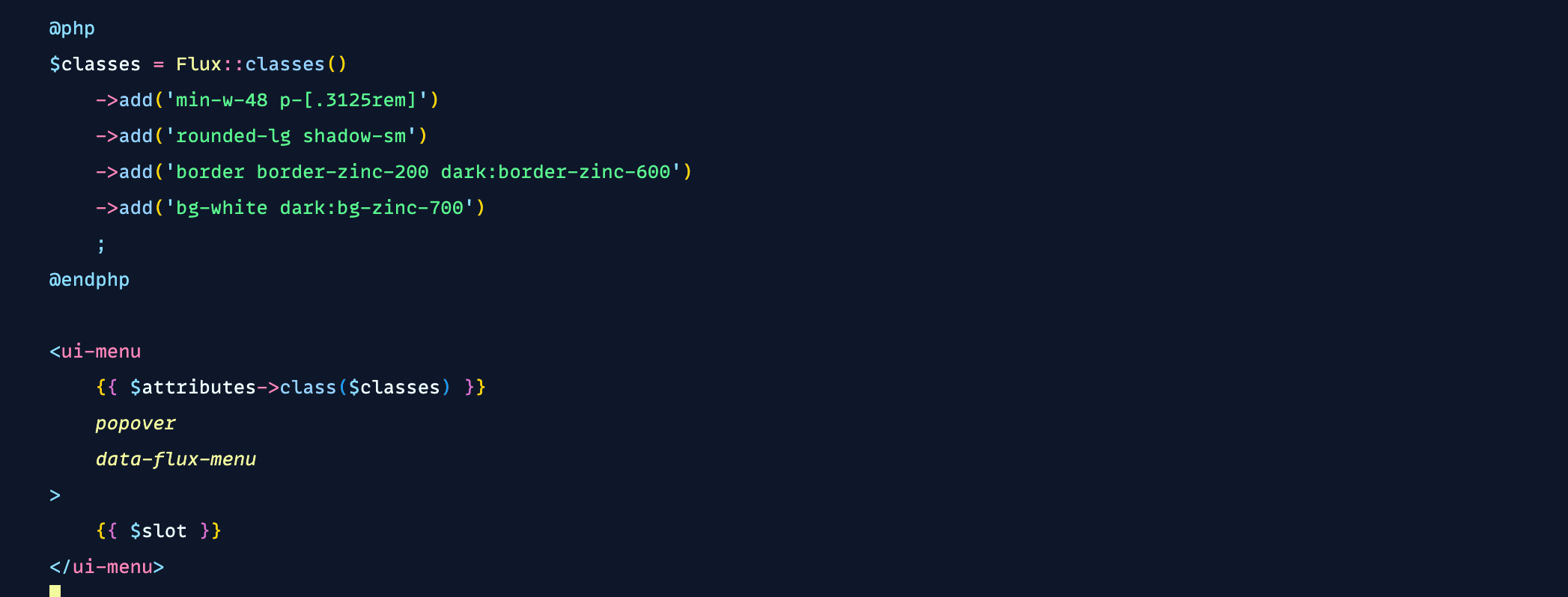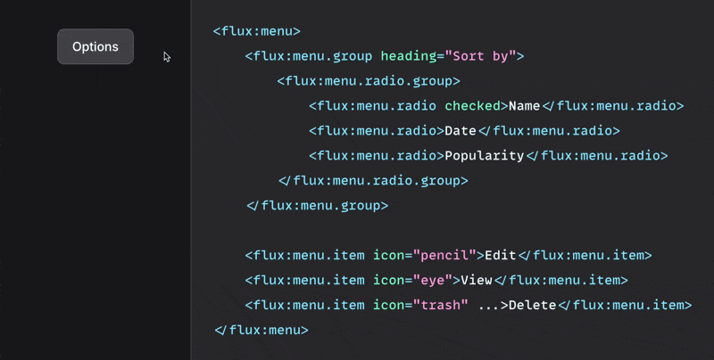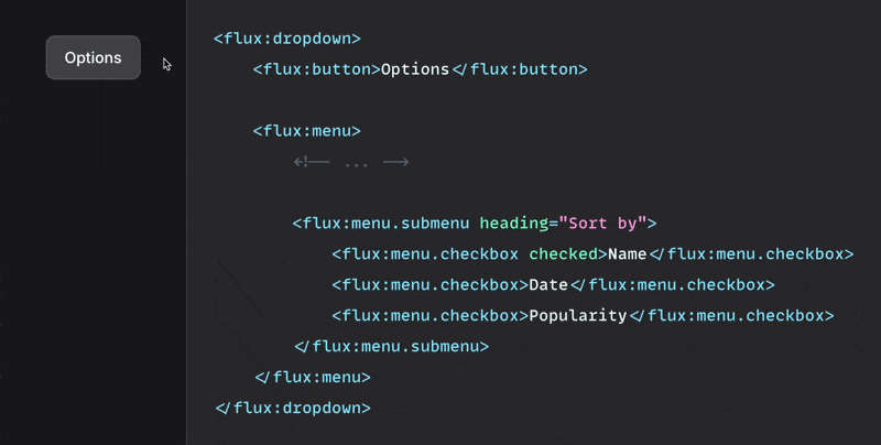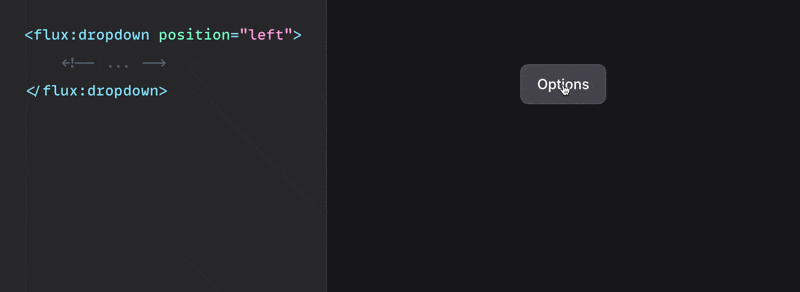 Of course, given the simple screenshot above, the answer is a resounding NO to all of these questions. So what does a complete action menu look like in Flux? Check it out: Ok, now we're cookin'. What about that keyboard navigation? While we're showing off, let's keep going. Here's how the Flux dropdown menu behaves when it gets cut-off by the bottom of the page: You can also customize the positioning of the menu with the position="?" property: We've only scratched the surface. What about menu item icons, keyboard hints, separators, groups, labels, checkboxes, radio buttons? We've got em. Check it out: That's all well and good, but it's still playing on "easy" mode. If you want to climb dropdown mountain, you'll need to beat the final boss at the top: SUBMENUS Deciding to tackle submenus changed the entire trajectory of this project. It marked a definitive point where I decided to go all in and make a world-class tool that would stand out even amongst component libraries in other ecosystems. Check it out: Submenus may seem harmless, but I assure you they are not. You have to handle all these extra focus and keyboard and mouse and positioning scenarios you didn't have to before. Especially if you want to support infinite nesting. And all of this is child's play in comparison to the cherry on top: Submenu safe areas. What are safe areas? They are invisible overlays between your cursor and a submenu allowing you to travel to submenus diagonally without closing the menu accidentally. Let me demonstrate by highlighting the safe area with CSS: Pretty next level right? "This is sick, but this must be an absolute monstrosity of a Blade component under the hood..." Nope, this is literally the contents of the `<flux:menu>` Blade component: I extracted all the tricky UI bits of Flux into custom web elements so that they are easy to style and maintain from Blade. Nothing about this dropdown is big, slow, or clunky. It's all lightweight and breezy fast. (I think I just invented the phrase "breezy fast") This also means I can ship bugfixes without you needing to modify your Blade files. I feel like I created an entirely separate JavaScript framework just for Flux. I'm nearly as excited about what's under the hood as I am about what's over it. If you're impressed by the level of care that went into this component, just imagine what went into the modal, tooltips, tabs, custom selects, comboboxes, autocompletes, radio/checkbox groups, toasts, etc. A LOT lol. So yeah. I'm making the whole dropdown component and the entire icon set free and open source today. Go to https://github.com/livewire/flux for installation instructions and start pulling this into your apps. If you like what you see? Hang tight till Sept 23rd when I launch the entire project officially. All your kindness and support means the world to me. Truly. Thanks for being a part of this wild ride, and let's make Livewire + Flux the most dangerous combo in all of web development. -Caleb |